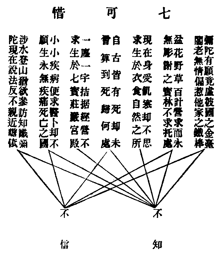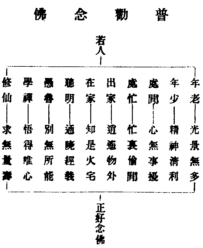 人在三界中,如在圍城內,急求出路,方能逃脫。乃幸而開得一門,可以直達家鄉,機緣豈可錯過。淨土法門者,透出圍城,直達家鄉之路也。釋迦如來,大慈大悲,憫念被圍之人,必受荼毒,所以開此捷徑之門,招人速出。此段經文,是最後叮嚀語,不獨教人諦信如來自己之言,并示以信受十方諸佛之語,悲心亦甚切矣。吾輩身荷大恩,無由上報,唯有如說修行,立弘誓願,求生淨土而已。謹將修持法門等,開列於後。