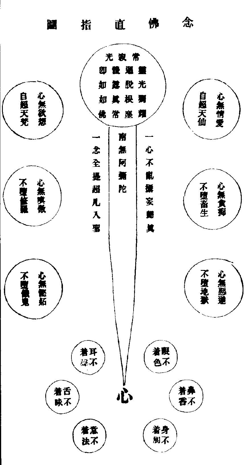 佛祖之所以異於人者,以其善用心與占地步而端趨向也。佛法之要,莫過於參禪、念佛、持呪、修觀、習經論、持戒善也,而念佛三昧最為尊特。葢人秪有一心,既此一心全提心佛,則一切妄念、雜念皆攝歸於不亂之正念,無始業識種子悉融化為獨露之真心,不別參公案而話頭自親,不細審戒律而梵行自淨,不修觀法而諦理自成,不持呪心而神功自顯,不分別名義而旨趣自臻,不涉歷階梯而地步自到。正以全提心佛,萬法皈依,不假方便,自得頓超,更無傍瞥偷心而能分心劫奪其快捷。此法門自遠公開宗結社於廬山,如十八高賢輩各感應,及臨終見佛,聖境現前而得往生者無筭,是皆一生取辦,不待來世再修,所謂一句了然超百億,不歷僧祗獲法身也。嗣是長安善導光明法師,南嶽承遠般舟和尚,雲峰法照五會法師,新定少康臺岩法師,永明延壽智覺禪師,昭慶省常圓淨法師,長蘆宗賾慈覺禪師。至我雲棲蓮池大師,中興淨業,集眾大成,為第八祖。正予所謂結束百千三昧法門,指歸一句念佛要旨。披六度而嚴法身,攝羣機而趣正覺。開化之盛,誠耀古彌今矣。蓋以念佛念心,如投胎帝王,即是王子,即登王位。其用心之圓,地步之高,趣向之上,非同臣僚從科第而漸次進取,始得親近尊貴也。故吾特作此圖,以百丈禪師全提向上之正令,以明馬祖即心即佛之宗旨,參合靈山、極樂二如來之直指人心,見性成佛之秘要也。