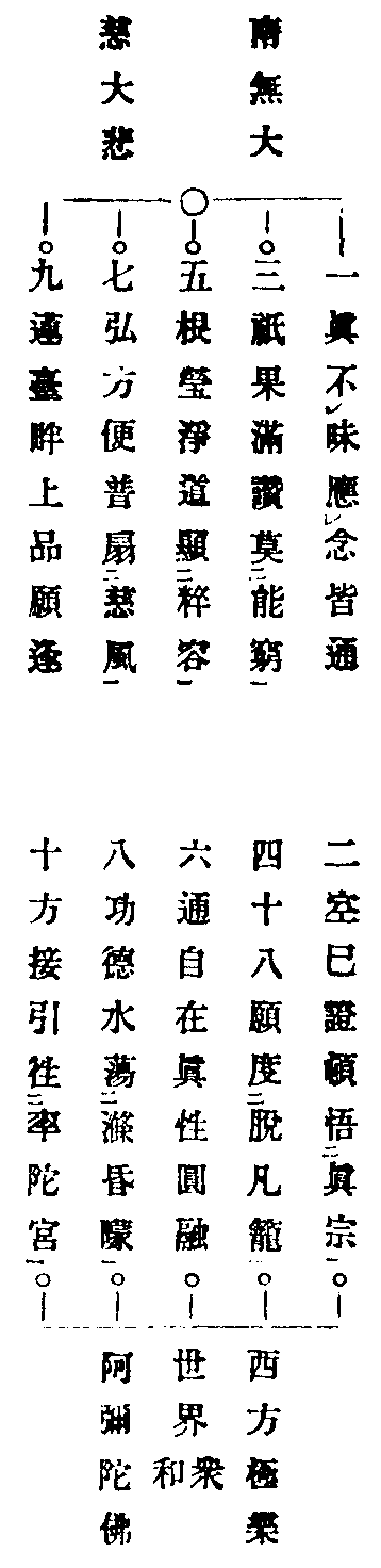 切以西方有佛,號曰彌陀。樹林水鳥,演法音珂。喝開耳聞,身振娑婆。金容蓮掌垂慈悲,示度亡靈出愛河。現前清眾,異口一音。同聲讚和,十佛名號。資助去魂,超昇淨界。亡者志心,應當諦聽。於此舉十念彌陀名號。