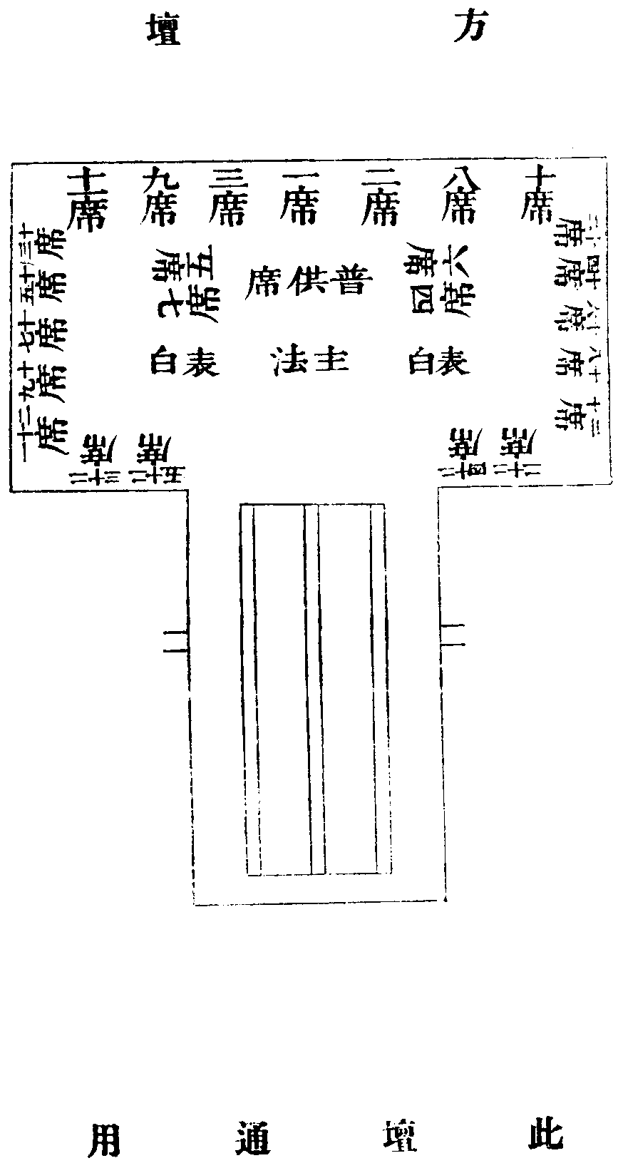 且汝未問者。尚可踵而說之。不敢苟同。非曰好異也。一主法自己發心異。必使如來量同。二不立齋主之案異。必使眾生心同。三正度人名不嫌其多異。必使解脫境同。四主表飲食淡薄異。必使感應理同。五表白不必板派異。必使大願體同。六執事不必過多異。必使清淨念同。七外壇不必二十四人異。必使敬信心同。八內壇事多夜行異。必使六根用同。九內壇樂器增減異。必使晝夜音同。十布施不矜多財異。必使求度因同。主法必自發心。悲度無極。方與一切如來。同其心體。若以白金聘至。與泛泛道場何別。恐少感格也。齋無其主。一切眾生。全主全賓。虗設一墊於主法旁。請上下堂。臨時選一人以隨叩。只要有心人。若立位安人。主賓分立。則行法反有不入神者也。第二十四席正度之機。千百同牌。十牌同位。不必以多金為美。或反致所度寥寥。必使一切人皆能勉力。以度其親。方為無憾。彼不信入。則無如何。一動念。已入此法界矣。蓋每名百錢而已。來者既易。行之不難。多請如來法住也。上下堂精美之供。出以享大眾。主表持呪。不可食之。另作平淡。粗粗取足。以精心通感為急也。表白太熟則專。專其利。則利物淺矣。不限生熟。臨時取知文少過之人用之。儀不求美觀也。多列執事。分費計耳。能二十四人作外壇固佳。不然。十二位亦足矣。十二人亦不妨空三五人。位必十二。以便送聖分駐二十四盤耳。西一至六。二十四席至十三席盤。東六至一。十二席至一席盤。盤借位一時暫駐。令一切人天展敬也。三四五更。冬夜足以集事。日出後鎖柵門。聽人於柵外拜觀。則動靜皆成法界也。鼓鈸繁瑣。不如金玉隨風。佐以雙鈴。疎密得所也。既不多索齋主金。則驕氣一除。敬心朗現。三寶放光也。