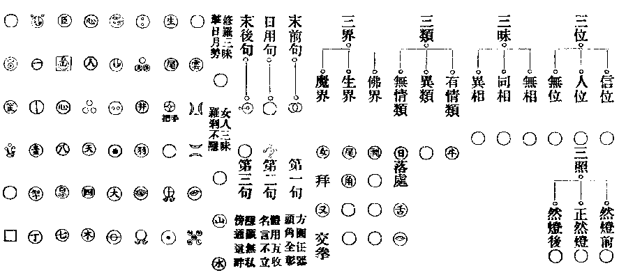 此為抱玉求鑑。答者當於其中書某字答之。[○@ㄙ]此為鈎入索續。答者當於厶字側添亻。乃問者鈎入。答者索續。共成寶器相。[○@(俬-禾)]此為已成寶器相。答者於中書土字答之。此為玄印玄旨相。獨脫超前眾相不著也。審如是。是猶市賈私為誌驗。三尺牧豎語之故。即無不喻。雖有聖智。不問不可強解矣。謂入聖位者。所建法幢乃如是乎。傀儡登場。癡人說夢。良可悲夫。祥符蔭曰。華嚴經偈云。如來得菩提。實不繫於日。諸佛出世。以大事了畢為一期方便。祖師紹佛傳法。化緣示見。亦不過空中電影。不住長空。所以諸祖行蹟。年月或闕而不詳。以法垂後世。雖千古不隔目前。如親承面稟也。又心燈光照。焰布無涯。非如世間箕裘嗣續。乃稱紹述。溈仰雲門法眼三宗。迄今正眼昭然。流輝並耀。浩劫有窮。斯文未泯。豈謂其傳世未永。宗統遂湮乎。編年闕疑。正所以示信。心燈綿亘古今。彼此不隔一線。帝網重重。交光涉入。後起明宗者。百世不惑。是在其人矣。