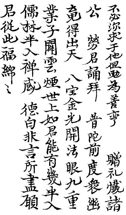 ○某。有老媼死。附家人言平生事。及陰府報應甚悉。家人環而聽之。某在眾中。忽攝心念佛。媼謂曰。汝常如此。何患不成佛道。問何故。曰。汝心念阿彌陀佛故。問何以知之。曰見汝身有光明故。村民不識一字。瞥爾顧念。尚使鬼敬。況久修者乎。是故念佛功德。不可思議出竹窓二筆。